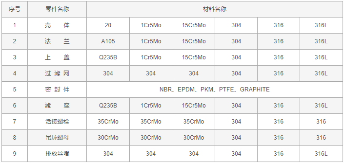 快开式T型过滤器零件材料: