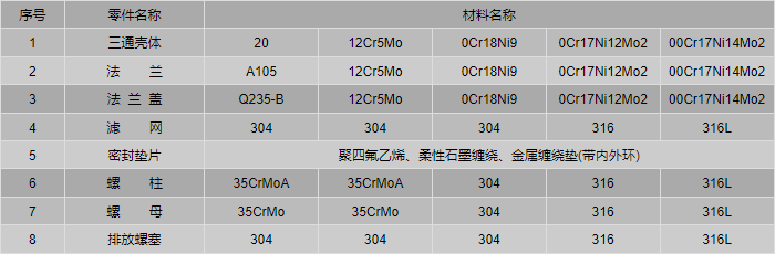 T型侧流式过滤器零件材料: