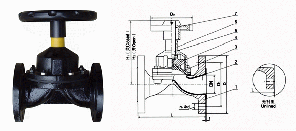 部件列表:1、阀体 2阀体衬里 3隔膜 4阀瓣 5阀杆 6阀盖 7手轮
