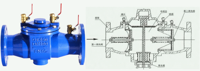 管道倒流防止器是一种严格限定管道中水只能单向流动的水力控制组合装置。它的功能是在任何工况下防止管道中的介质倒流,以达到避免倒流污染的目的。产品用于防止生活饮用水管道发生回流污染的安全装置,防止饮水回流污染新颖阀门,以确保生活饮用水的卫生和安全;本产品具有结构合理性、使用方便、密封性能强、坚固耐用及造型美观等特点。广泛用于电力、冶金、石油、化工、煤气、城建、造纸、纺织、医药、食品、船舶、给排水、能源等领域。