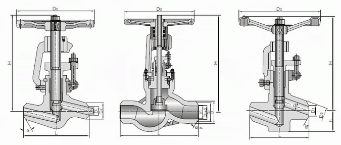 美标高压焊接截止阀产品设计制造按E101和JB/T3595—93标准的规定,结构合理,性能优良,造型美观。阀门中腔采用压力自紧式密封结构,密封性能越好。支管两端为焊接结构。焊接坡口可按标准或用户要求配接。 阀瓣、阀座的密封面采用司太立(stellite)钴基硬质合金堆焊而成,耐磨、耐高温,抗擦伤性能好、使用寿命长。 阀杆经调质和表面氮化处理,有良好的耐腐蚀性和抗擦伤性。阀盖填料函深度合理,填料加缓蚀剂,密封可靠。美标高压焊接截止阀外形结构图:
