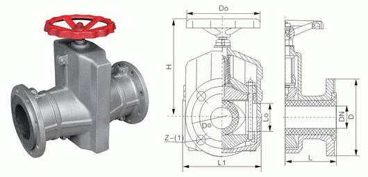当顺时针转动手轮时,使大小阀杆同时带动上下压板,压缩管套进行关闭。反转即行开启,这样压板在拉杆之间上下往复运动完成阀门开闭工作。