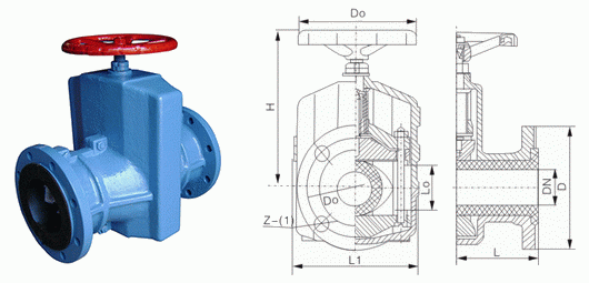 当顺时针转动手轮时,使大小阀杆同时带动上下压板,压缩管套进行关闭。反转即行开启,这样压板在拉杆之间上下往复运动完成阀门开闭工作。