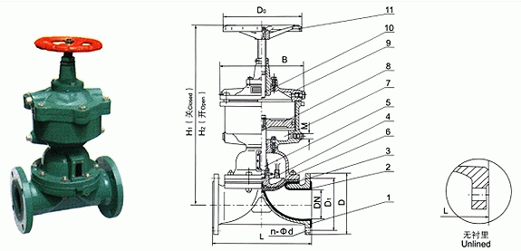1、阀体 2、阀体衬里 3、隔膜 4、阀瓣 5、下阀杆 6、阀盖 7、气缸 8、活塞 9、气缸盖 10、上阀杆 11、手轮