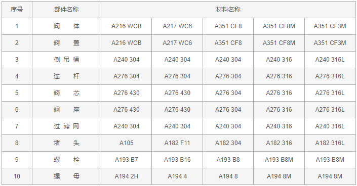 982、882倒吊桶式蒸汽疏水阀零件材料: