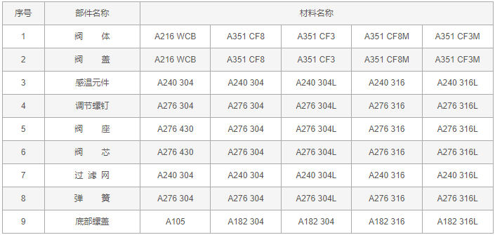 可调恒温式疏水阀零件材料:
