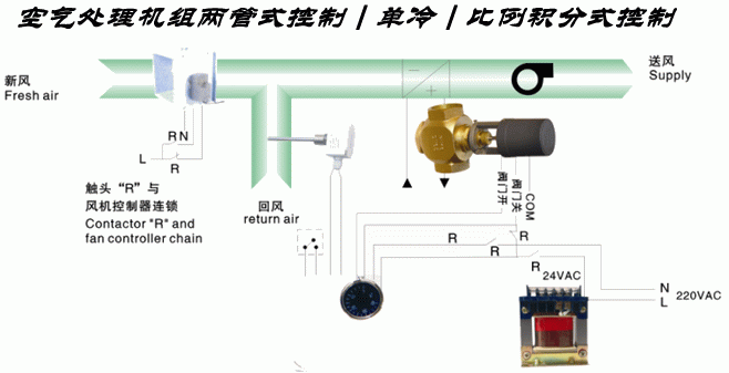 3、冬季制热:当温度传感器检测到室内温度低于温度控制器设定的温度时,电动调节阀开启,流量增大,反之,当温度传感器检测到的室内温度高于温度控制器设定的温度时,阀门关闭,流量减小。图中R触头组可与风机连锁,当风机启动时新风风门打开,温度控制器电源被接通,整个系统受控;当切断风机电源时,风机停转,新风风门关闭。