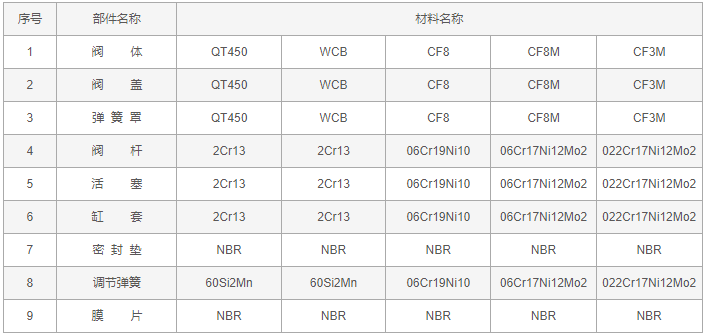 减压稳压阀零件材料: