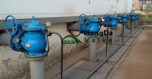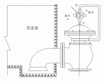 隔膜式快开排泥阀又称膜片式快开排泥阀,是一种由液压源或气动源作执行机构的角型截断类阀门通常成排安装在沉淀池底部外侧壁,用以排除池底沉淀的泥砂和污物。膜片式快开排泥阀由尼龙强化橡胶隔膜将阀门分为两个腔室,接通液压或气动源,采用电动或手动二位四通换向阀控制,实现快速排泥。该阀将隔膜代替活塞无运动摩擦,更适用于泥浆等颗粒介质,大大提高了阀门的使用寿命。隔膜式快开排泥阀安装示意图: