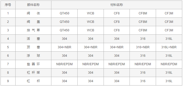 污水高速排气阀零件材料: