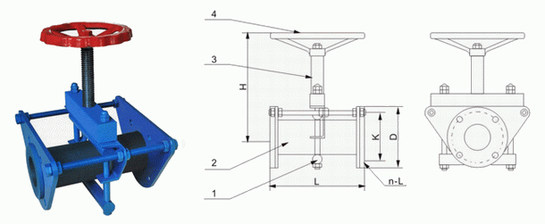 本阀门由阀体、橡胶套管、阀杆、上下压板、拉杆、手轮等零件组成。