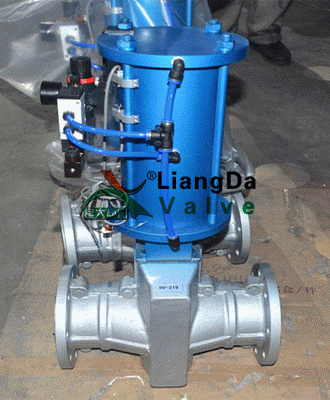 气动头通气时,使阀杆向下运动来带动上下压板以压缩套管进行关闭,反之即开启。压板在拉杆之间上下往复运动完成阀门开闭工作。