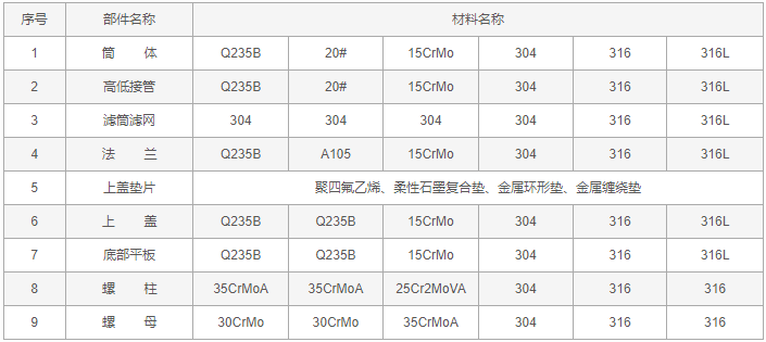 高低接管篮式过滤器零件材料:
