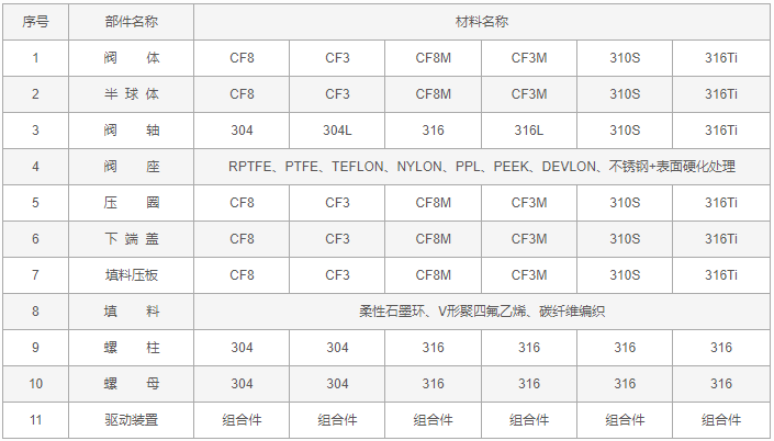 不锈钢偏心半球阀零件材料: