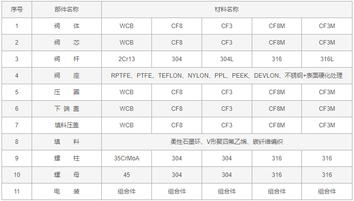 电动V型球阀零件材料: