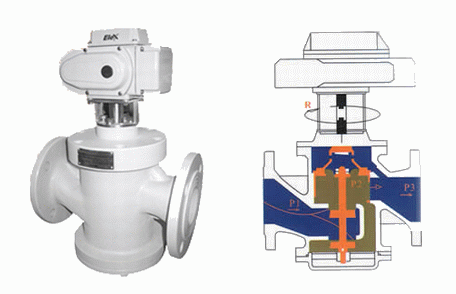 (2)、当直行程电动执行器接受控制信号使阀轴延A—B向上下运动(或角行程电动执行器接受控制信号使阀轴延R向旋转)时,P2、P3间的开度也随之变化。由于不管系统压差(P1-P3)如何变化,P2、P3间的压差(P2-P3)始终不变,因此对应于任一开度位置,其输送的水流量都是一定的,并且实际的流量特性曲线与其理想的流量特性曲线是一致的,没有偏离。因此这种电动调节阀较传统的电动调节阀具有更好的调节特性。