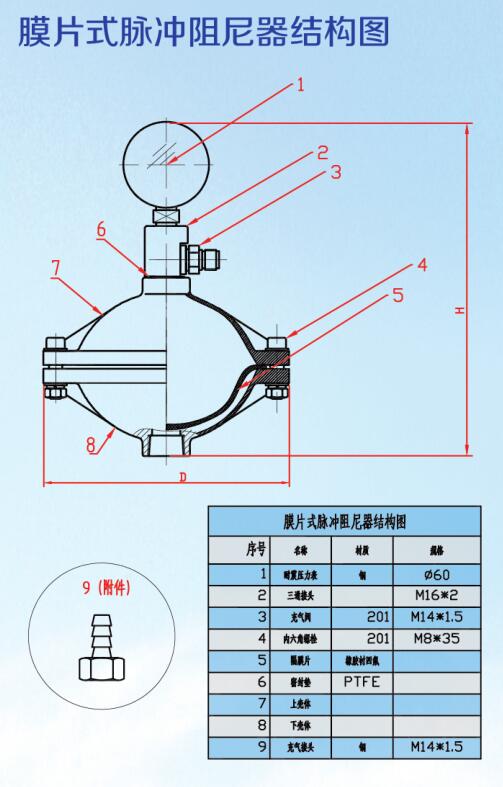膜片式脉冲阻尼器分为上下壳体,中间由聚四氟乙烯、橡胶复合膜片分隔,是常用的脉冲阻尼器。最大的优点就是隔膜将预充气体和管路中的液体分开,方便维护,在合适的选型、充压条件下,能够减少绝大多数的脉冲。膜片式结构,介质和压缩气体分离,保证长期稳定运行。接触介质部分只有下壳体和膜片,常规膜片采用橡胶衬四氟形式,四氟做过多向滚压处理,耐腐蚀性好,使用寿命高。