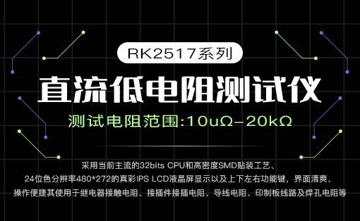 RK2517系列直流电阻测试仪采用当前主流的32bits CPU和高密度SMD贴装工艺、24位色分辨率480*272的真彩IPS LCD液晶屏显示以及上下左右功能键,界面清爽、操作便捷;其使用于继电器接触电阻、接插件接插电阻、导线电阻、印制板线路及焊孔电阻等;温度补偿能免除环境温度对测试工作的影响;RK2517系列提供了多种接口功能,可方便的与PC进行数据通讯和远程控制。