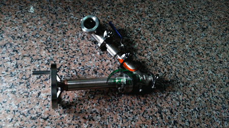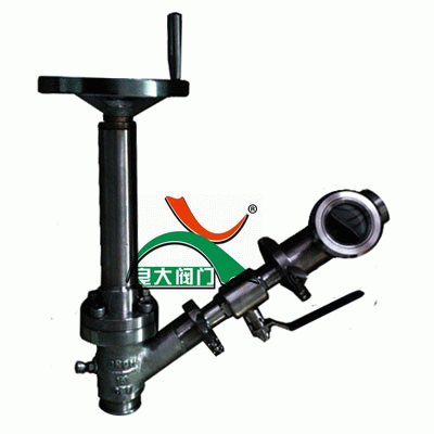 3、卡箍式真空柱塞取样阀进出口为60度阀,形态如“Y”字。通常可称Y型阀或角阀,也可属于角阀中的一种特殊阀。此阀通常进口为外丝,出口为内丝。但此阀采用进口法兰式,出口卡箍连接方式。出口配卫生级球阀及视镜容器。精小形阀阀柱采用两段T型槽连接,阀柱螺纹部 与阀柱螺母相配,阀柱螺母靠螺纹旋紧在阀盖上,然后用销钉固定。阀杆和手轮连接,然后用螺母压紧,这样旋转手轮就可以开启或关闭阀门 。